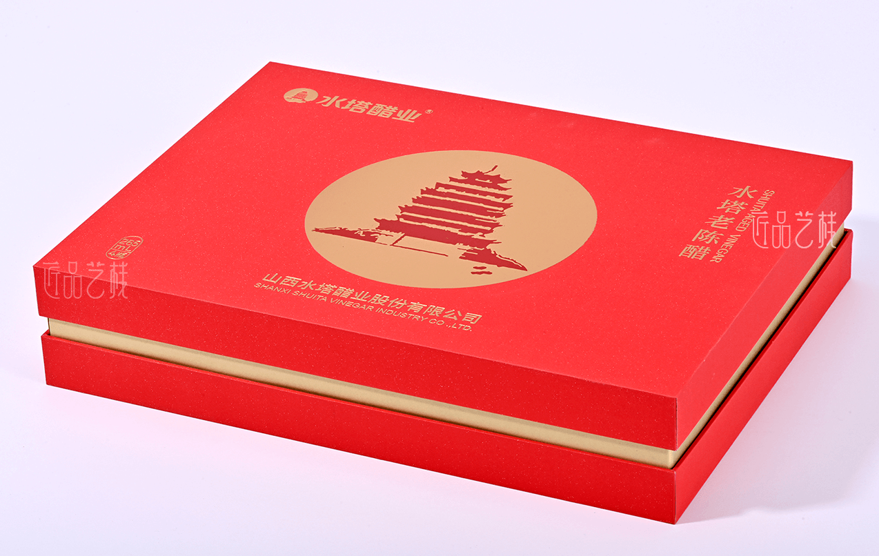 水塔醋業(yè)位于“中國醋都”山西清徐縣,是國家八部委命名的全國農(nóng)業(yè)產(chǎn)業(yè)化重點龍頭企業(yè),在其包裝盒印刷定制中,采用天地蓋禮盒套裝結(jié)構(gòu),在中國紅色的面紙上精制細砂與浮雕燙金工藝,搭配枊釘扣手提袋工藝,使整個包裝禮盒呈現(xiàn)出高端、精致的輕奢尊貴體驗感。