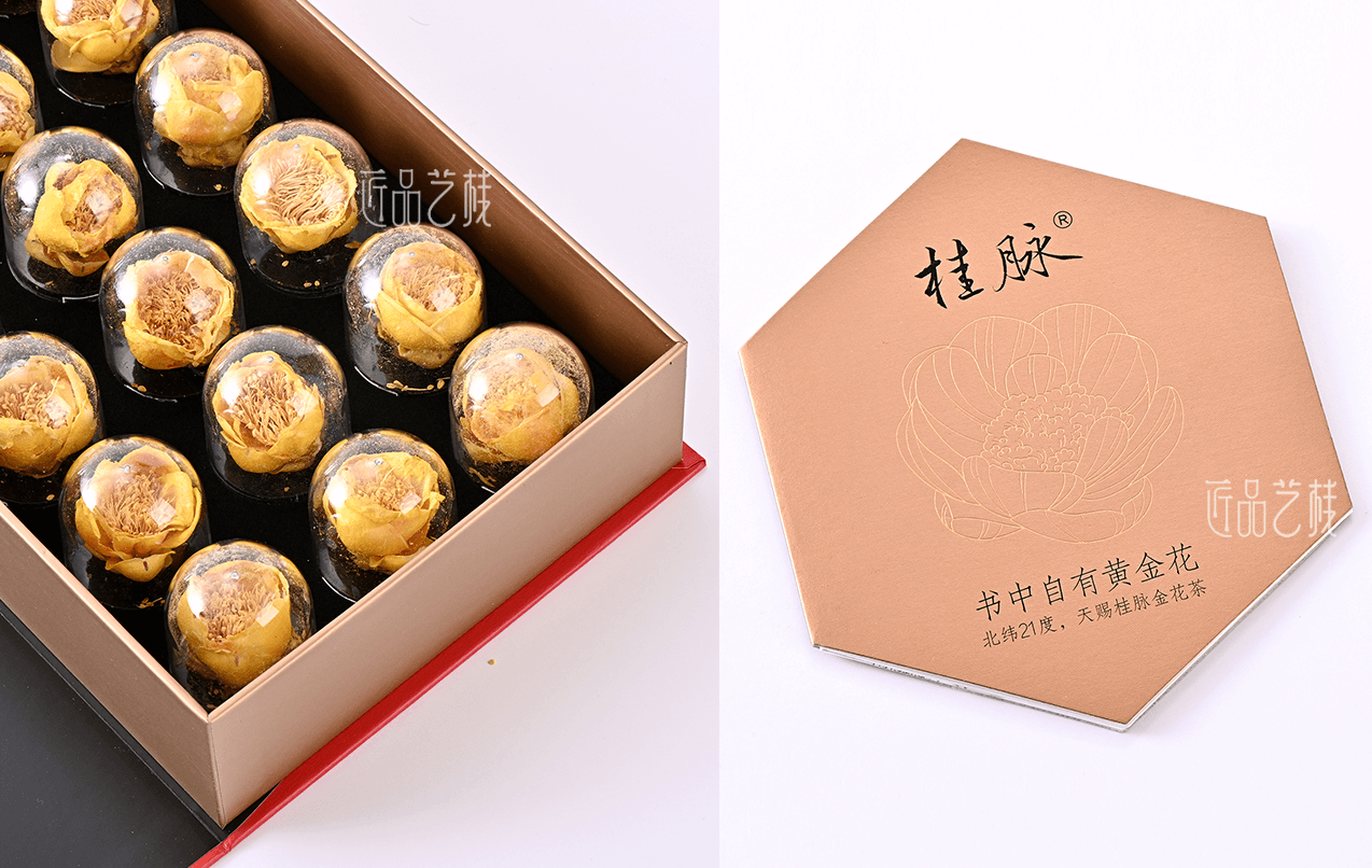 桂脈金花茶,源自北緯21度,新資源食品,部分含量遠高于保健食品標準。由佳潤隆包裝印刷&匠品藝棧提供本產(chǎn)品的包裝盒、手提袋和說明書等整套禮盒的方案設(shè)計與印刷制作,在比其原有包裝盒將近節(jié)省一半制作成本的同時,大力提高了該產(chǎn)品的溢價能力和銷售利潤。